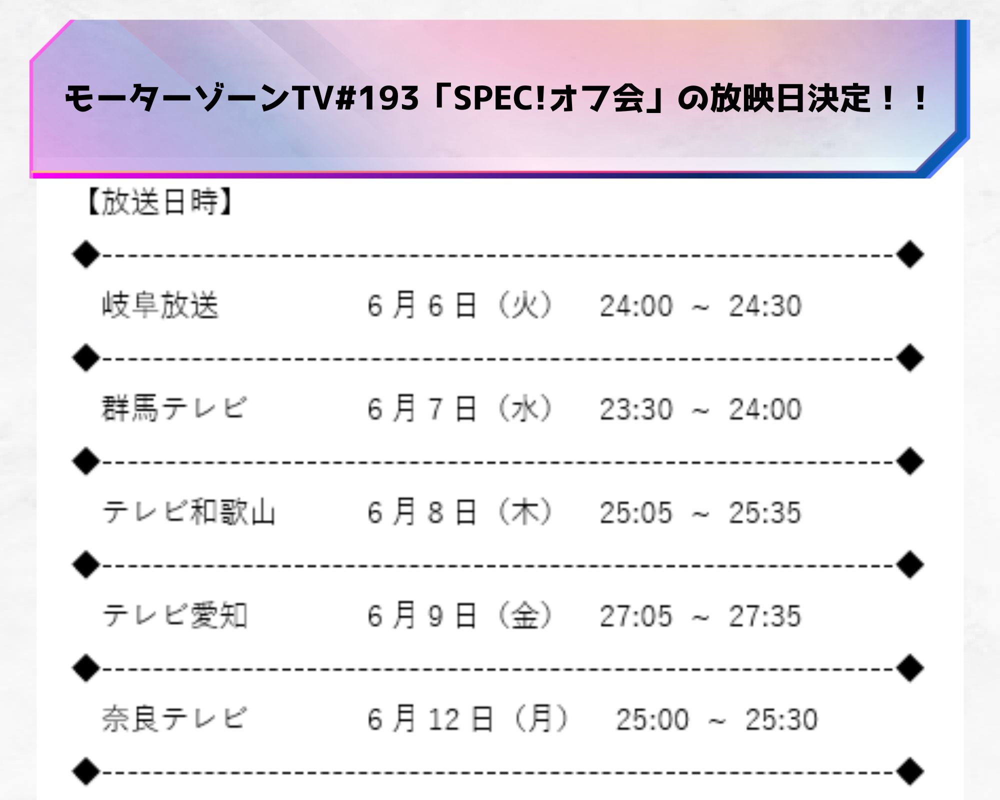 | 2023/5/26 | モーターゾーンTV #193 「SPEC!オフ会」の放映日が決定しました!
