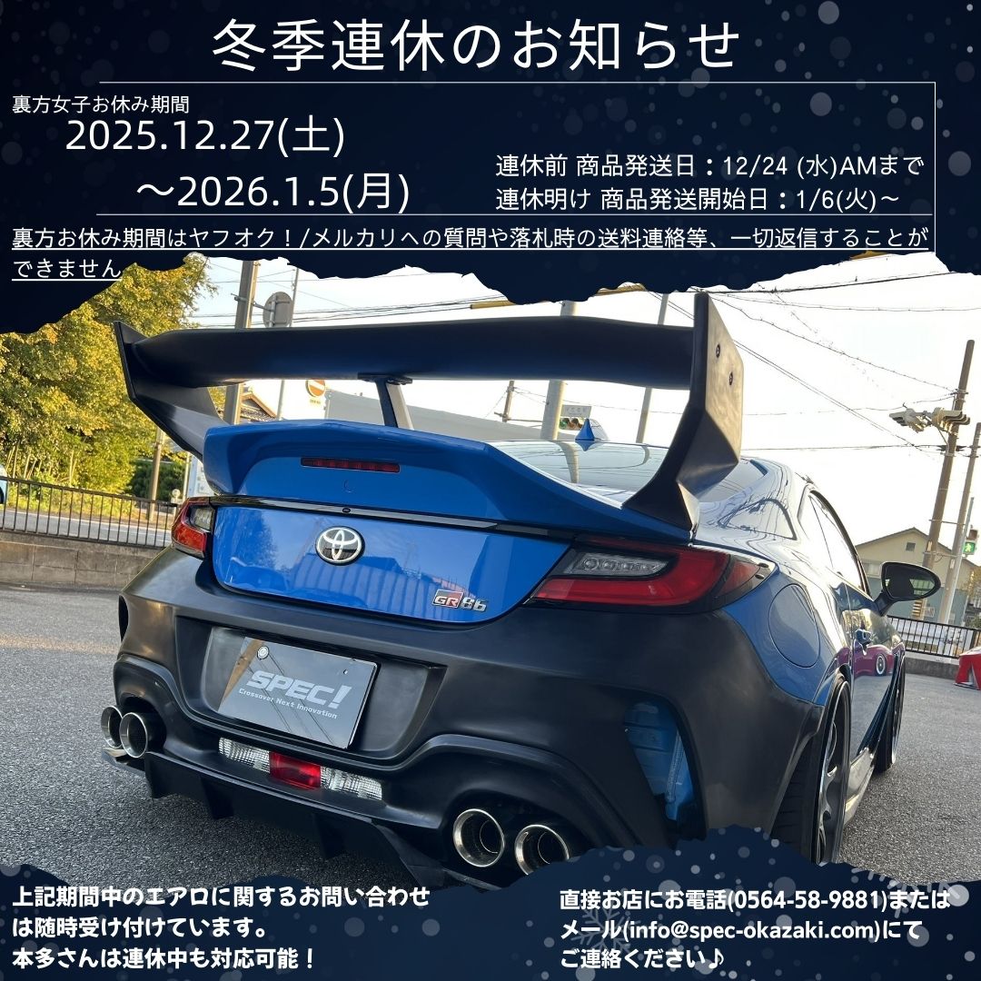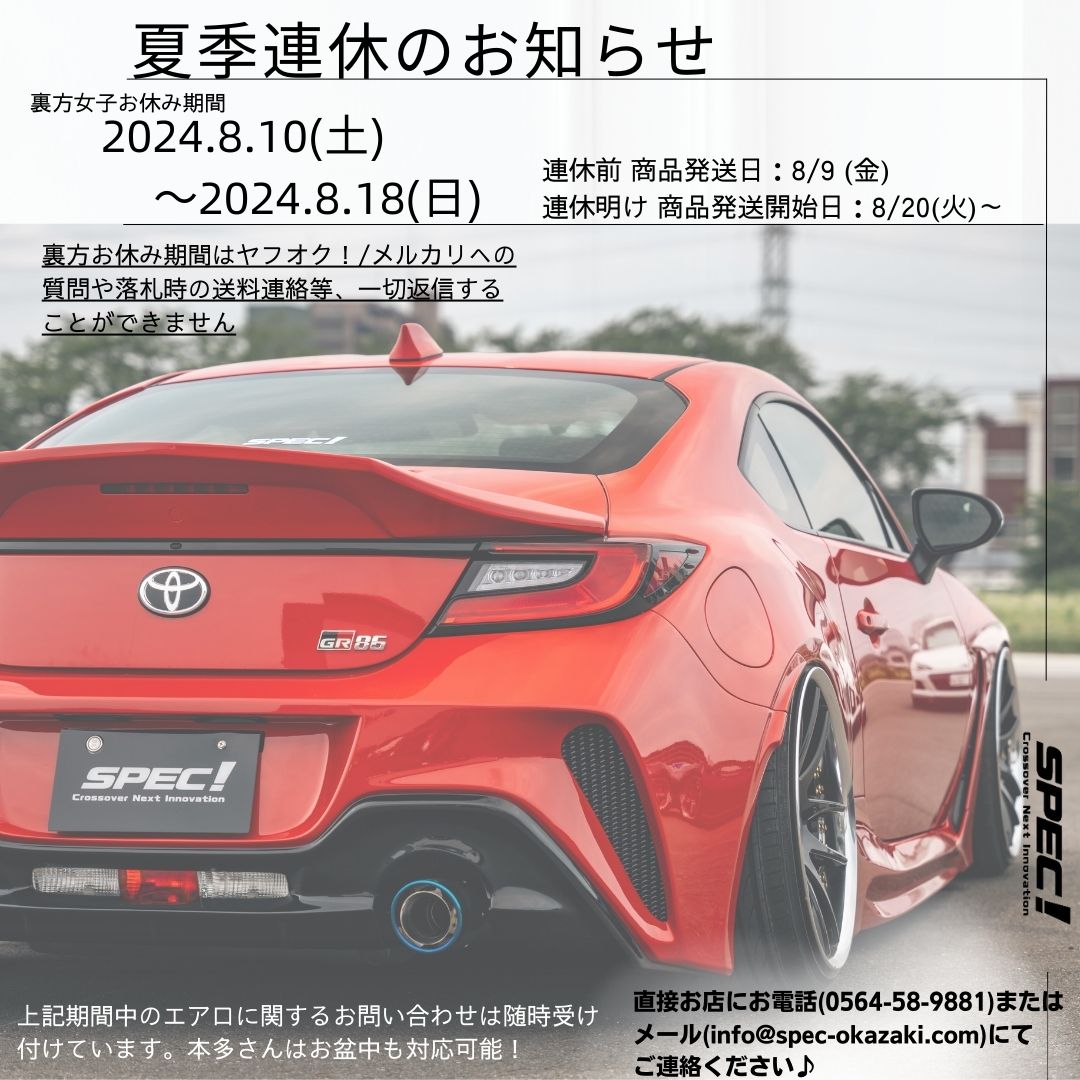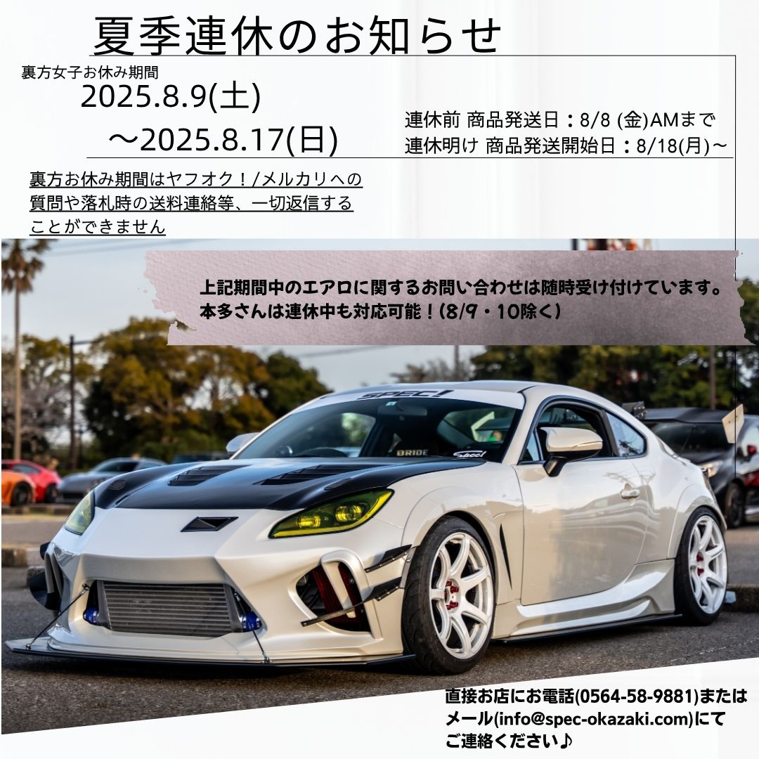 | 2025/8/4 | 夏季連休に関するお知らせです 連休前商品発送日:8/8 (金)AMまで 連休明け商品発送開始日:8/18(月)~ 夏季 裏方お休み期間:8/9(土)~8/17(日) 連休期間はヤフオク!/メルカリへの質問や落札時の送料連絡等、一切返信することができません。 上記期間のエアロに関するお問い合わせは 随時受け付けています。本多さんは連休中も対応可能!(8/9.10除く) 直接お店にお電話(0564-58-9881)またはメール(info@spec-okazaki.com)にてご連絡ください。 |