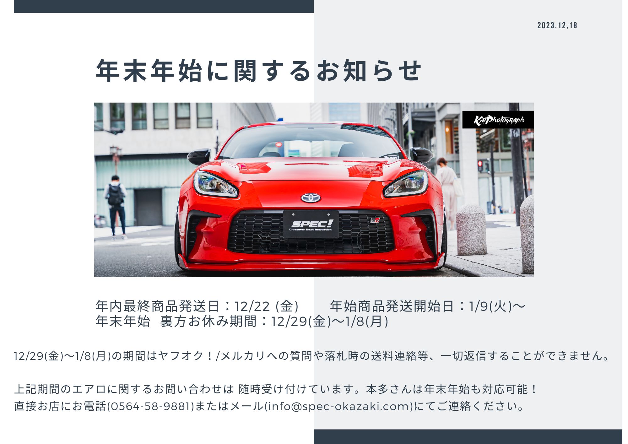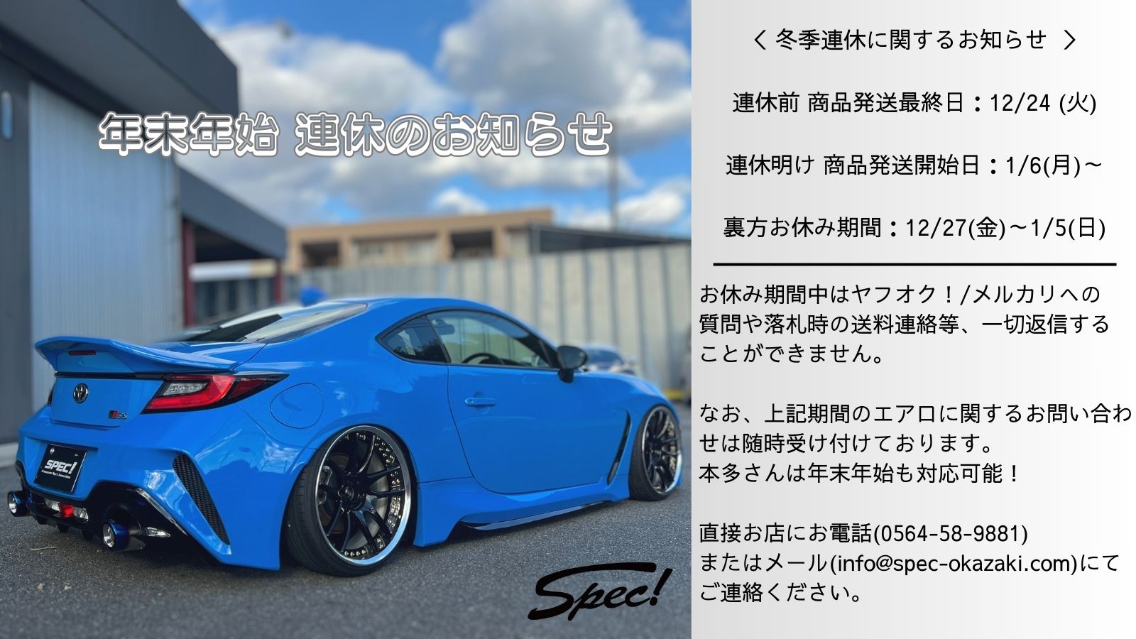| 2023/12/18 | 年末年始に関するお知らせです 年内最終商品発送日:12/22 (金) 年始商品発送開始日:1/9(火)~ 年末年始 裏方お休み期間:12/29(金)~1/8(月) 12/29(金)~1/8(月)の期間はヤフオク!/メルカリへの質問や落札時の送料連絡等、一切返信することができません。 上記期間のエアロに関するお問い合わせは 随時受け付けています。本多さんは年末年始も対応可能! 直接お店にお電話(0564-58-9881)またはメール(info@spec-okazaki.com)にてご連絡ください。 |