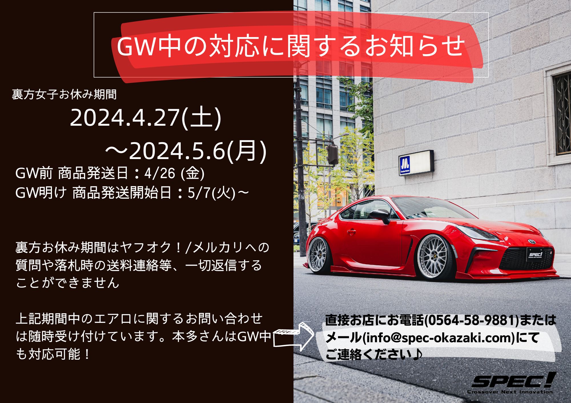 GWに関するお知らせです GW前 商品発送日:4/26 (金) GW明け 商品発送開始日:5/7(火)~ 裏方お休み期間:4/27(土)~5/6(月) お休み期間中はヤフオク!/メルカリへの質問や落札時の送料連絡等、一切返信することができません。 上記期間のエアロに関するお問い合わせは 随時受け付けています。本多さんはGW中も対応可能! 直接お店にお電話(0564-58-9881)またはメール(info@spec-okazaki.com)にてご連絡ください。 |