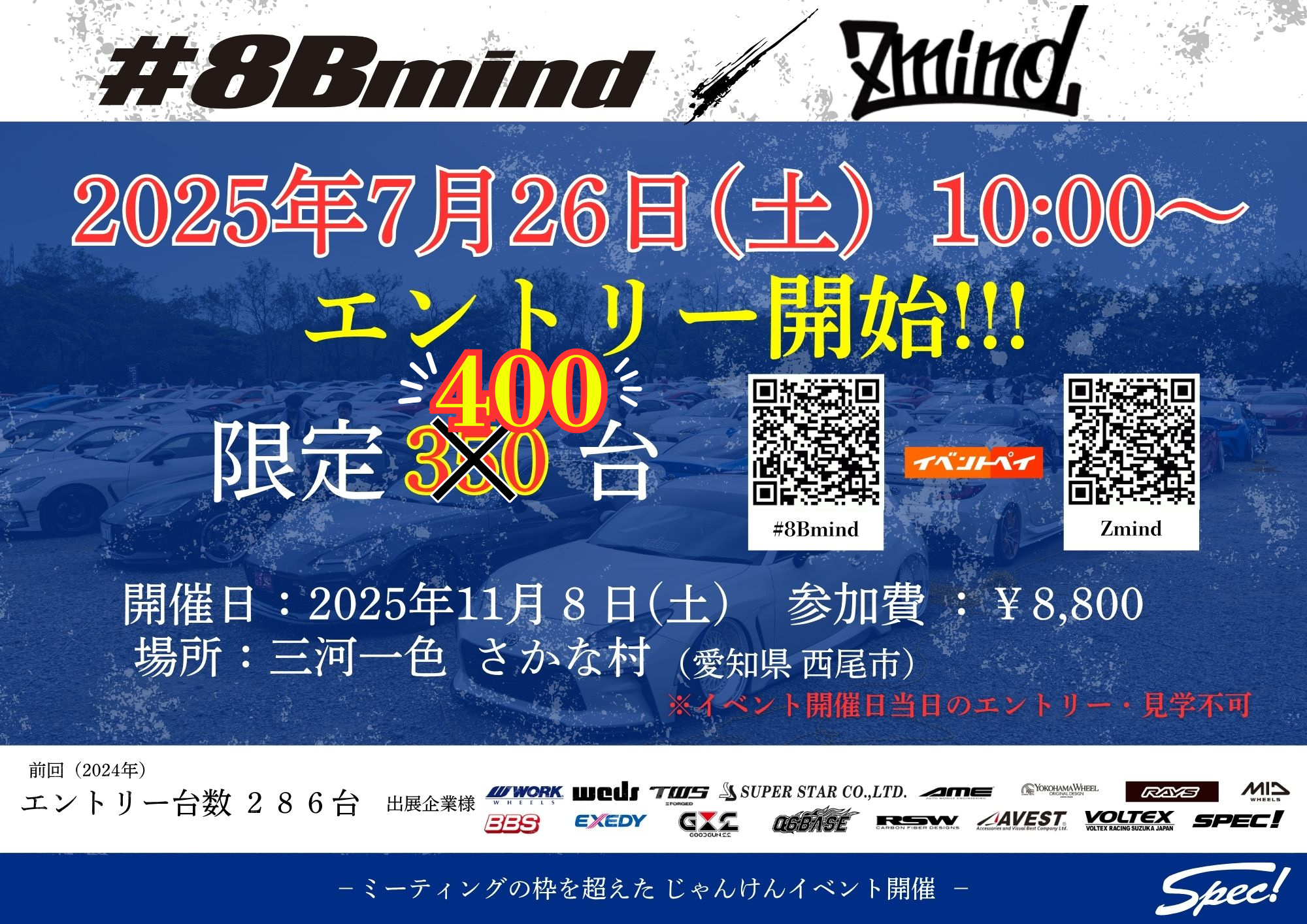 | 2025/7/25 | 2025.7.26(土)10:00~ #8Bmind/Zmindエントリー開始!!! #8Bmindエントリーご希望の方はコチラ → #8Bmind